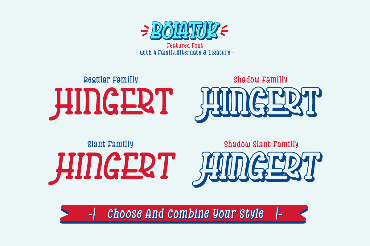 Bolatuk, a playful display font bursting with whimsy and charm. Each letter is a burst of color and joy, infusing your designs with a sense of playfulness and fun. Ideal for children’s books, posters, or cheerful branding, Bolatuk adds a spark of imagination to every project, turning ordinary into extraordinary.