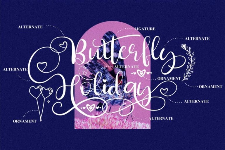 Butterfly Holiday is a romantic and delicate Script Font. This font is neatly crafted and highly detailed. Whatever the topic, this font will be a wonderful asset to your font library, as it has the potential to enhance any creation.