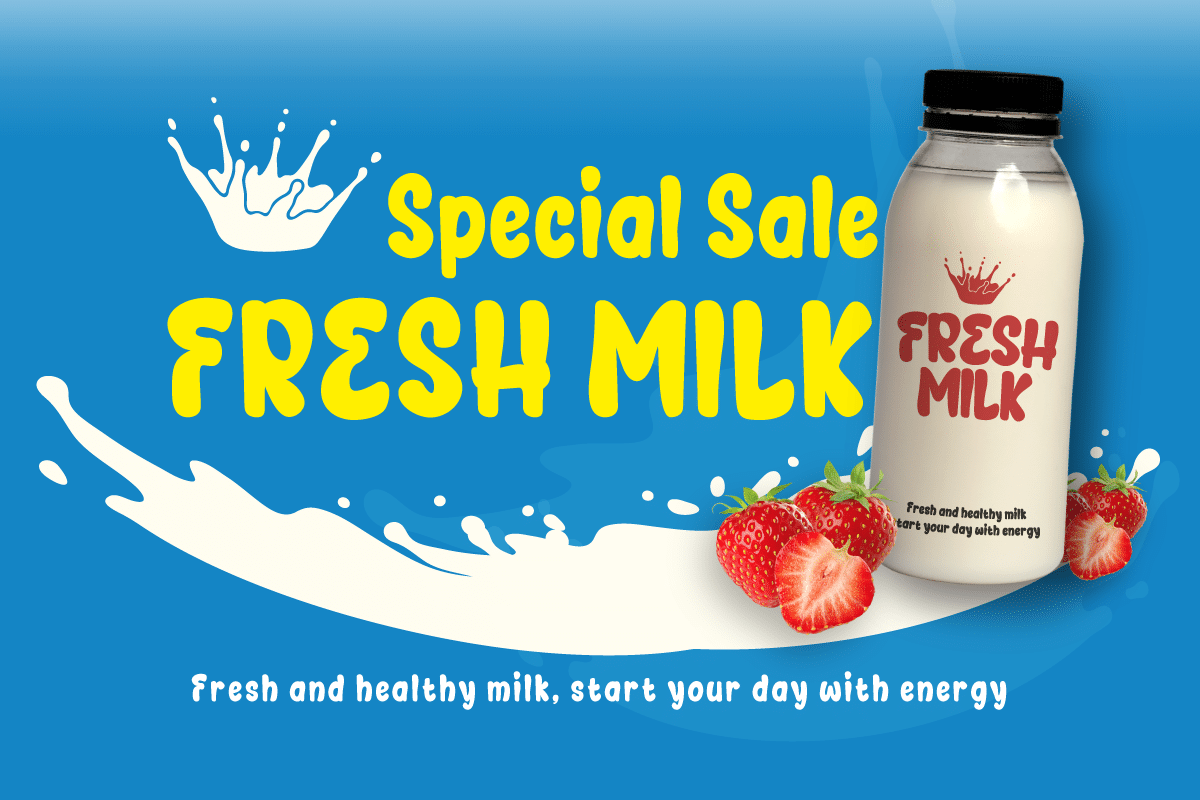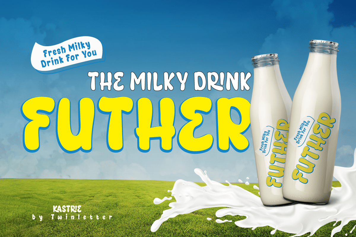 Kastrie is very flexible for various design applications such as packaging labels, advertising, promotional media, and store branding. The thickness of the letters still ensures good readability even when used as a large title or headline. The visual combination of bright colors, a milk drop illustration, and a blue background creates an inviting impression.