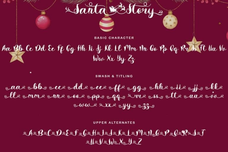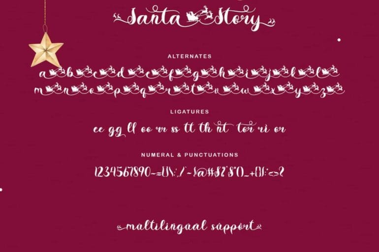 Santa Story is a special Christmas font but can be used for any type of work. This font has a unique design with ornate lettering santa equestrian. This font is very easy to use, because it has been specially designed and there is also a guide on how to use it in the preview. “Santa Story” is equipped with uppercase and lowercase letters, alternative uppers, swash and titling, alternates, ligatures, numerals and punctuations, as well as multilingual support.