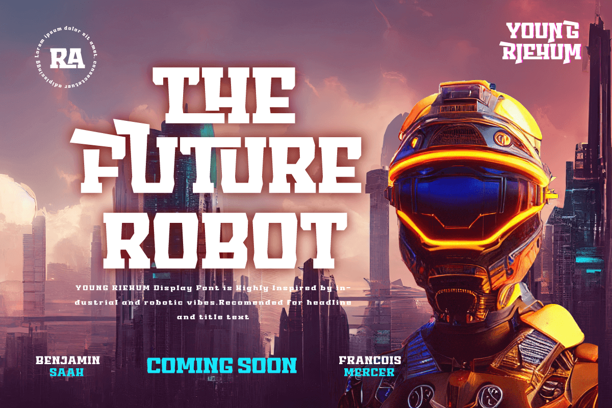 Young Riehum, a superhero-style display font that will bring strength and tension to your projects. If you’re looking for a strong, bold, and bold font, Young Riehum is the perfect choice for creating an electrifying look in the worlds of film, gaming, and design. With a striking presence, Young Riehum grabs attention instantly and delivers an unforgettable message to your audience. Each letter exudes electrifying energy, giving your projects a new dimension and creating an extraordinary experience.